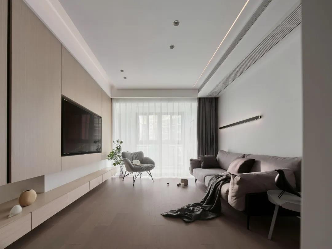 客厅采用无主灯设计,很好的利用了点光源和线性光源,营造出空间的立体感和温馨的家庭生活氛围。