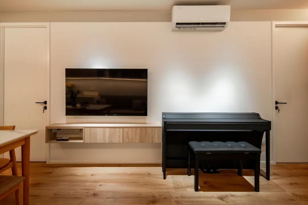 客厅悬挂的电视机以及一架钢琴,既能享受美妙的琴声,又可以安逸的观影,涌现出一家人其乐融融温馨的画面。