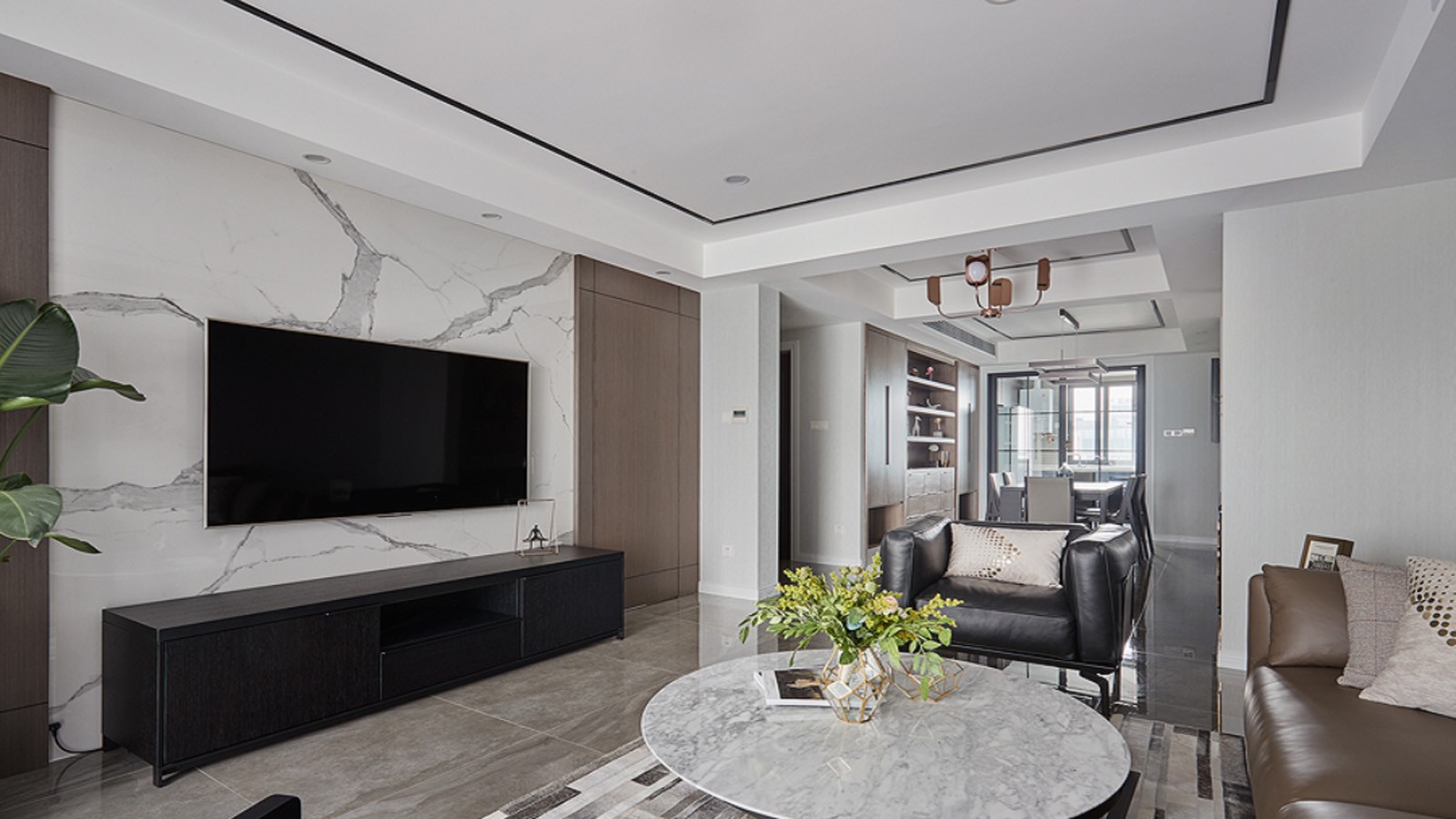 在公区卫生间的布置上,因为居住人数不多,所以我们没有将洗手盆刻意分离出来。而是在洗手间内部做了干湿分离的形式,吊顶也选择了防水性和美观度俱佳的埃特板吊顶,同时预留检修口方便后期检修。