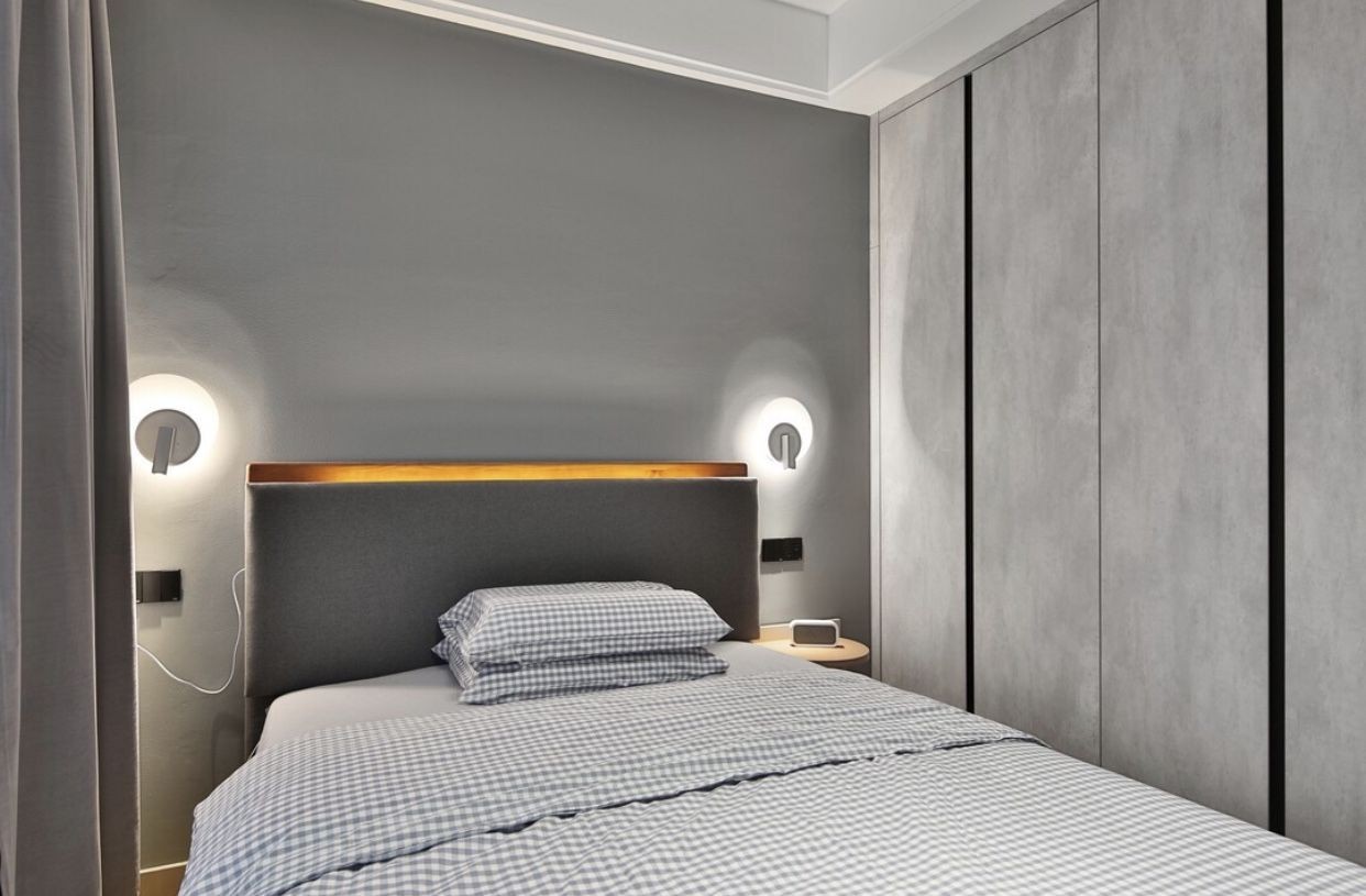 主卧空间大了不少,所以可以有空间做了一个大衣柜。而且灯饰的装饰也是很有特点的,让人眼前一新的感觉。