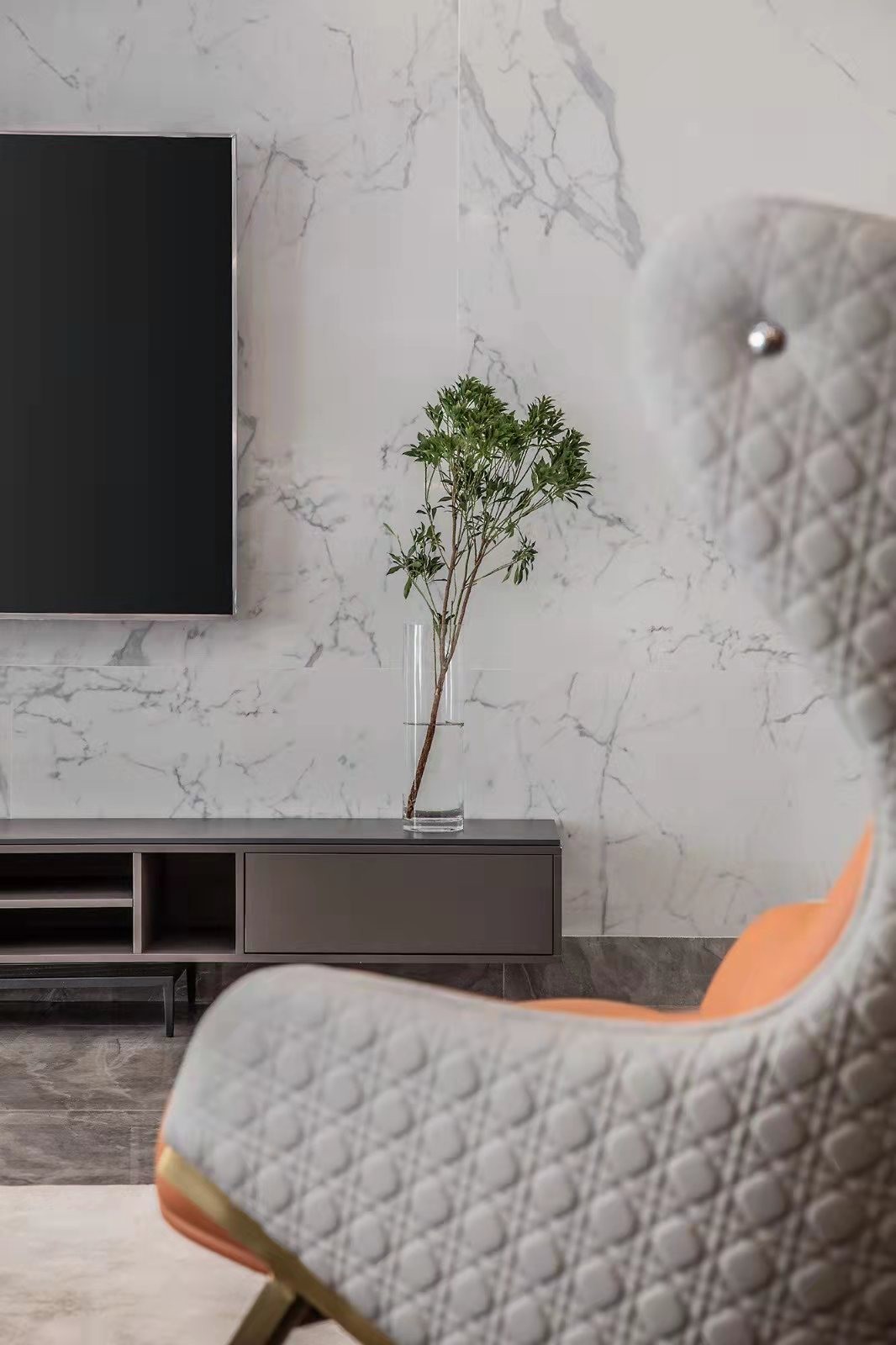 白色大理石纹墙砖作为影视墙面加灰褐色极简电视柜外点缀一株绿植现代风拉满