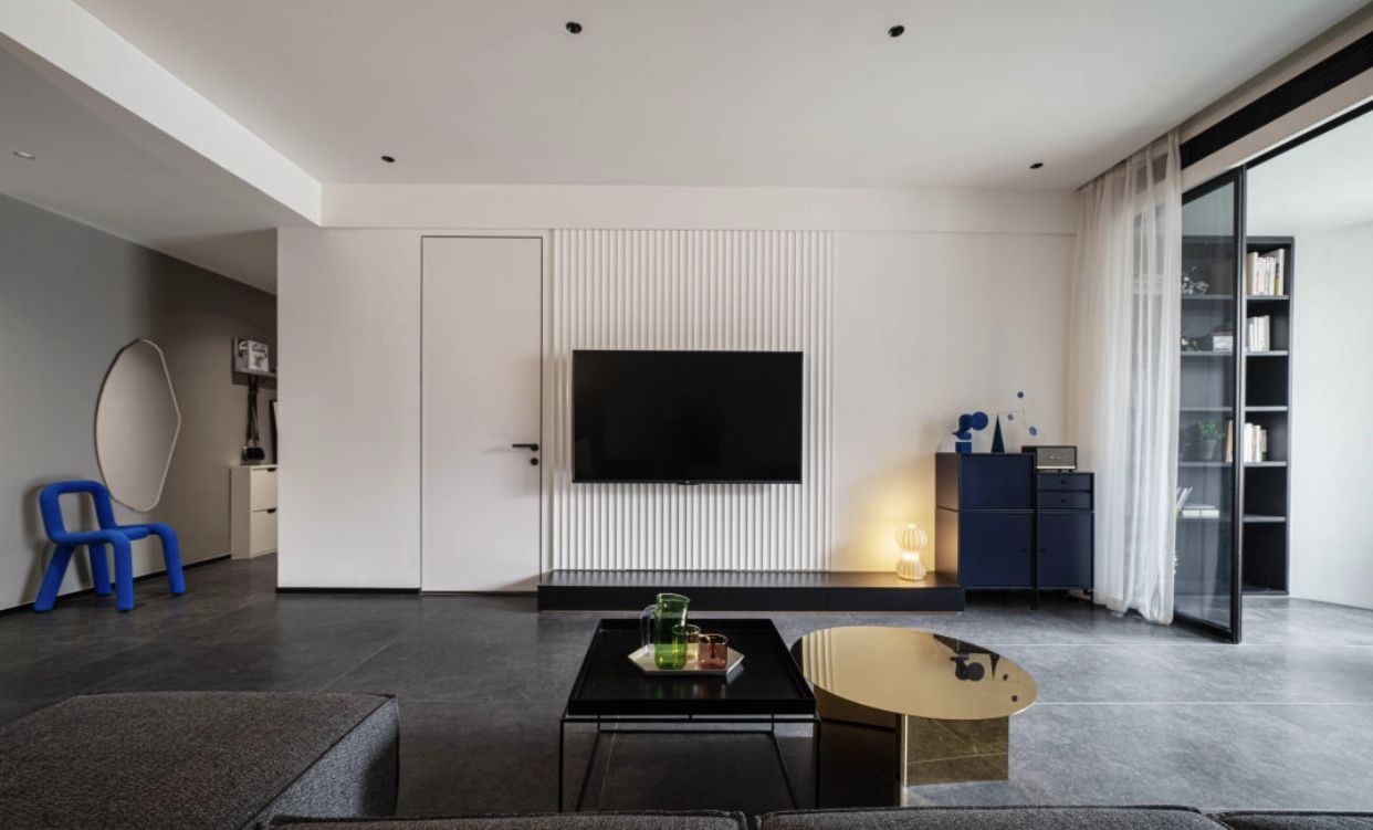 从阳台看过去客厅与餐厅,动线明确,视觉开阔。餐厅对面墙用木饰面装饰,木饰面+乳胶漆的拼接效果让整个客餐厅没有那么沉闷,很好地过渡了入门走廊两面白墙的压迫感。