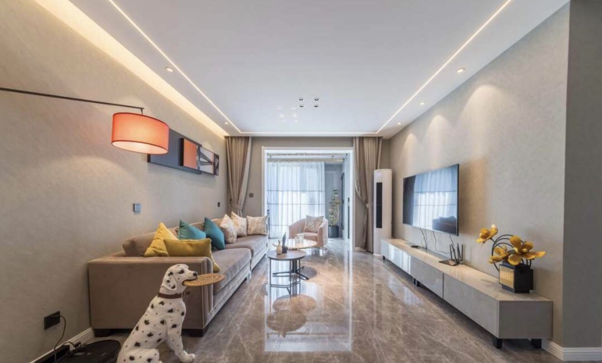 客厅顶面的光源全部采用散光源来均匀分布照明,洗墙、氛围与基础照明都在厅的空间内实现了照明的功能优化。