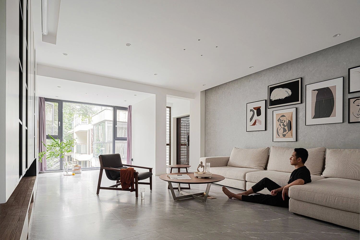 沙发墙没有继续用“一贫如洗大白墙”,冷色调 棉麻质地的灰墙综合下来很像“铁汉柔情”,冷峻的外壳包裹着棉麻的舒服质地