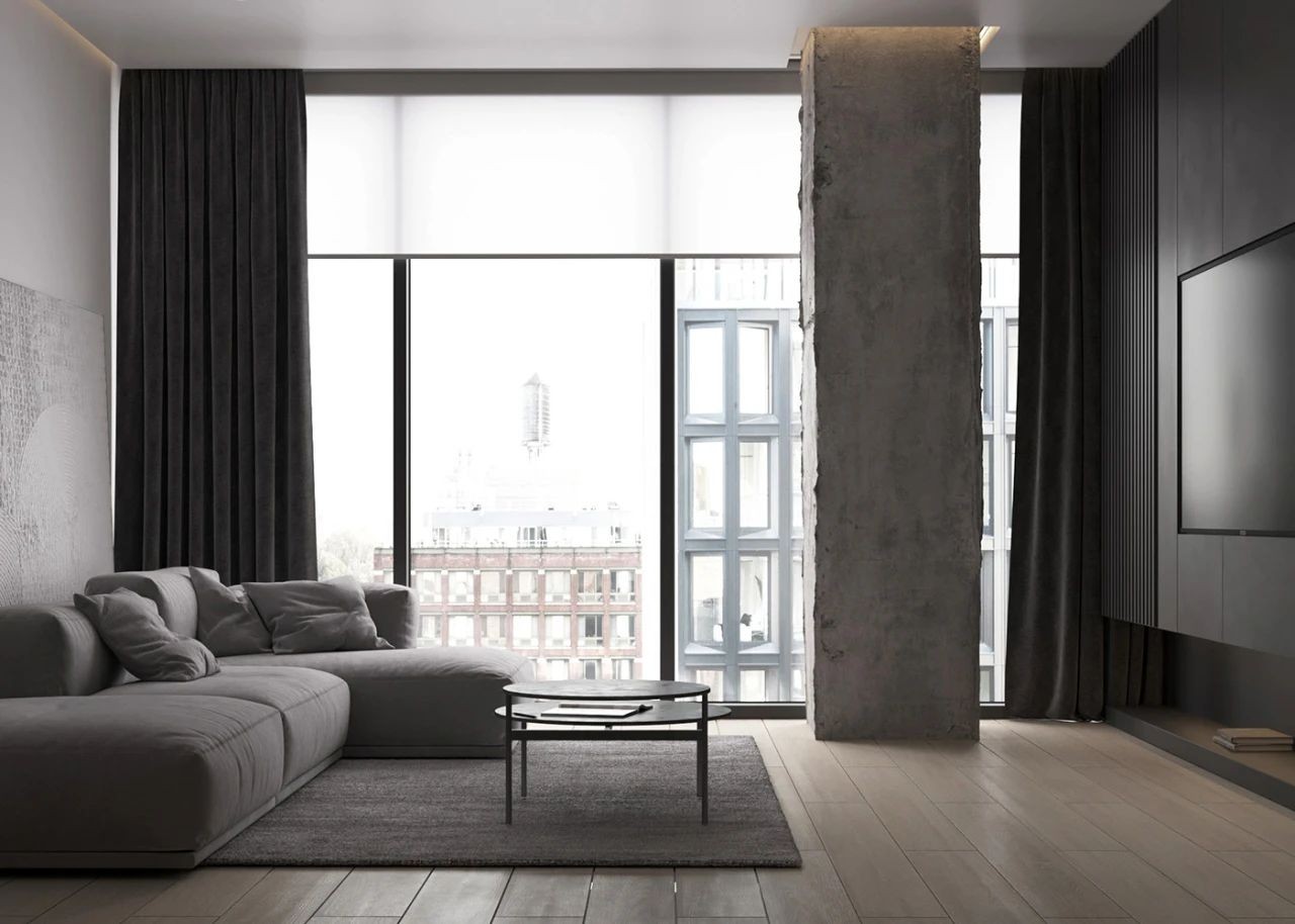 客厅空间整体呈沉稳色调,其中电视储物墙与餐厨设备墙,一体成型,占据一侧墙面