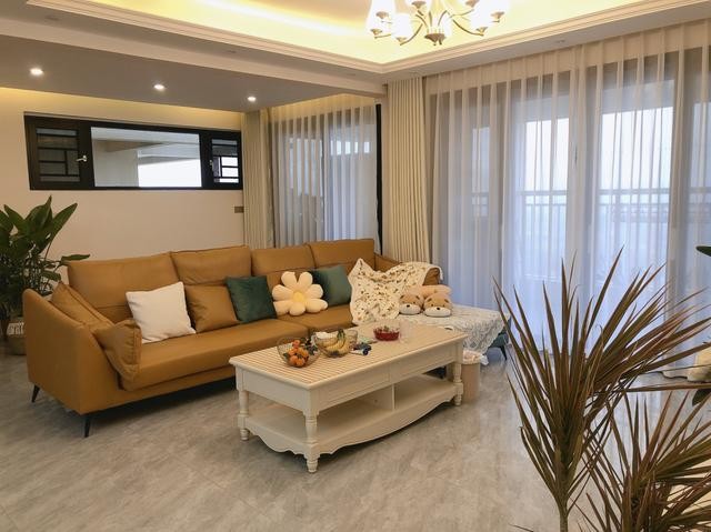 电视墙侧面的角度,可能很多人都觉得不要做电视墙,但是电视墙贴石膏线条,效果更好看,比大白墙的效果更有档次。电视机和茶几都是一样的米白色,款式还是蛮不错的。窗帘后面有独立的阳台,收起窗帘的话,阳光都可以照入。