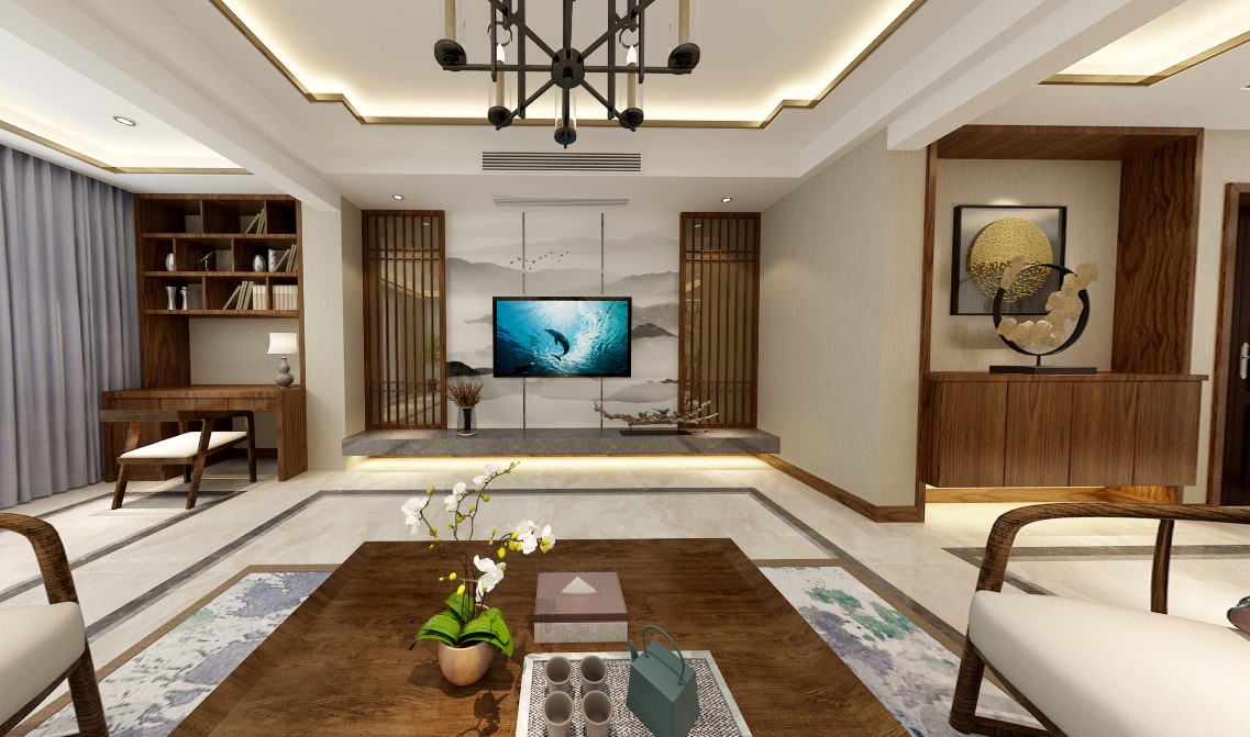客厅电视背景使用木格栅搭配山水,充满禅意