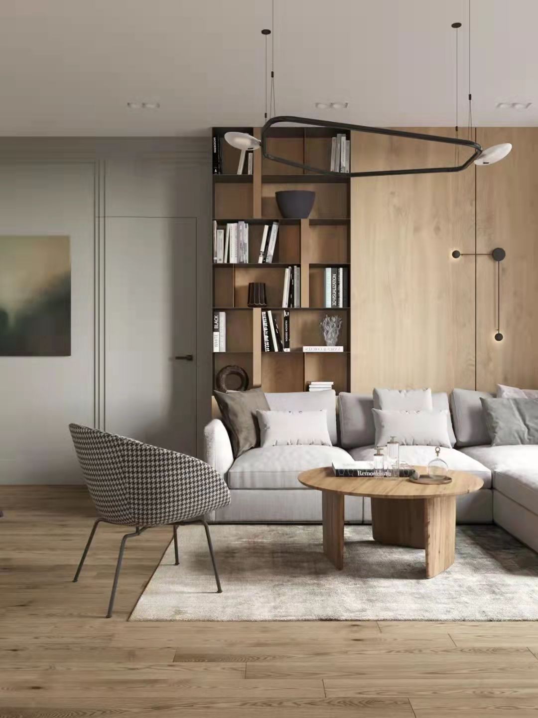 地板与橱柜皆为暖色木质搭配冷色青灰墙面与沙发非常和谐