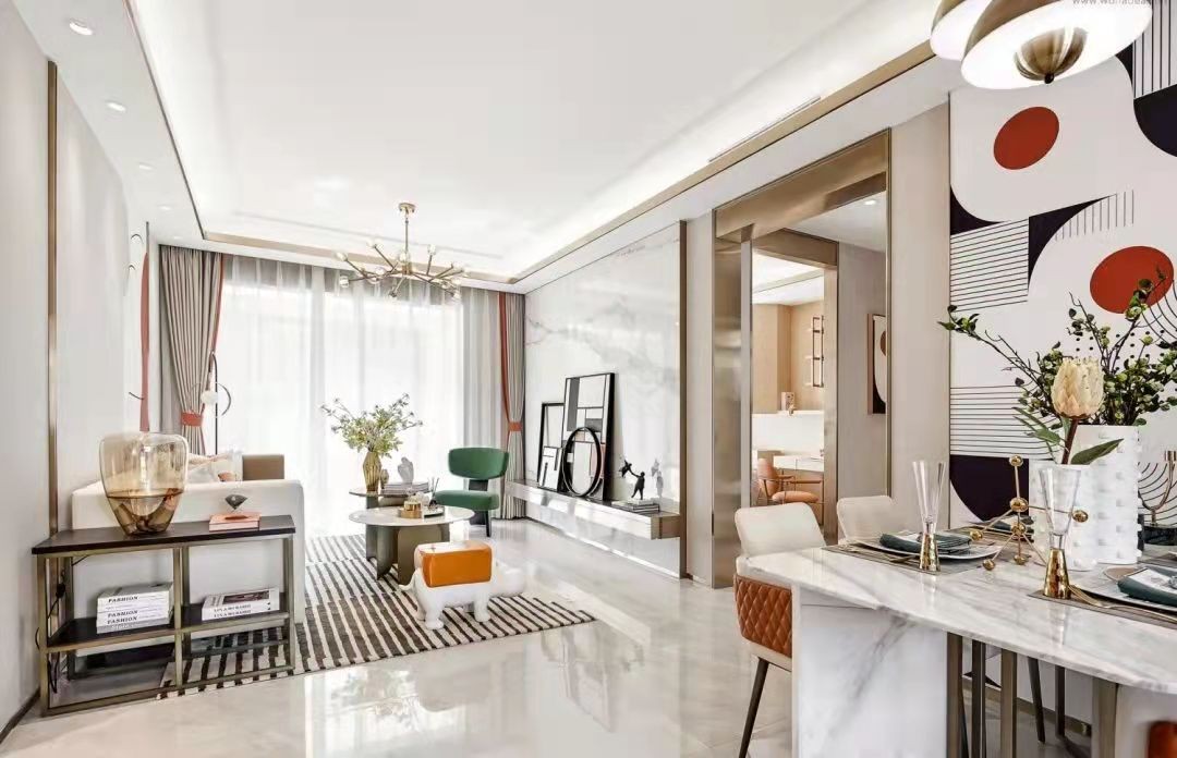 灰色与绿色的床单,白色与黄色的枕头,在橙色床头装饰画的背景下,呈现出一种素雅的端庄感。