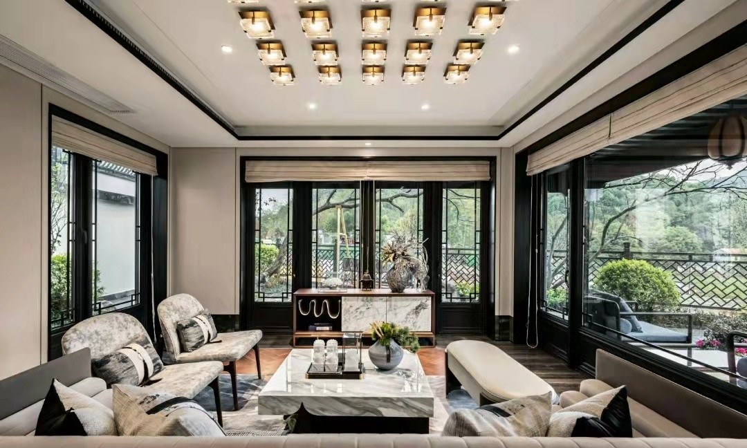 此屋有两面玻璃墙室内非常透亮加着亮面木地板与顶面设计呼应