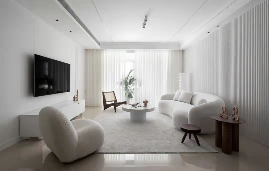 客厅采用无主灯的天花,结合整体素色的硬装+软装