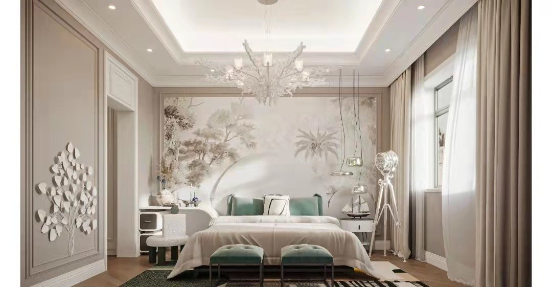 白色墙顶衔接粉灰色墙面背景墙为绘画图案搭配具有设计感的灯饰