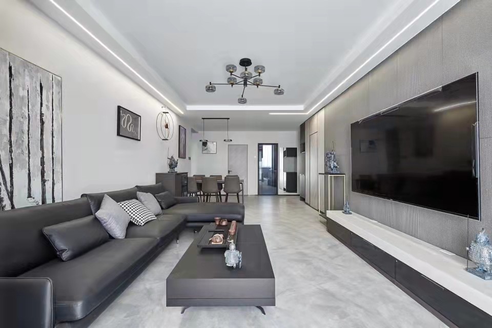 客厅采用大量冷色系材质和元素搭配,线型灯使空间更具有空间延伸感,灰色仿大理石电视墙+简易金属置物架