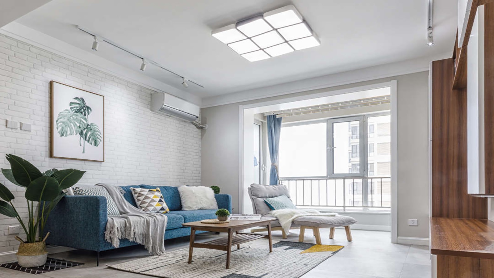 客厅大窗选用素色窗帘作为中间调在整个空间的大面积色彩部分起到了很好的衬托作用,饱和度较低的浅色花纹地毯在空间内提亮了地面空间。