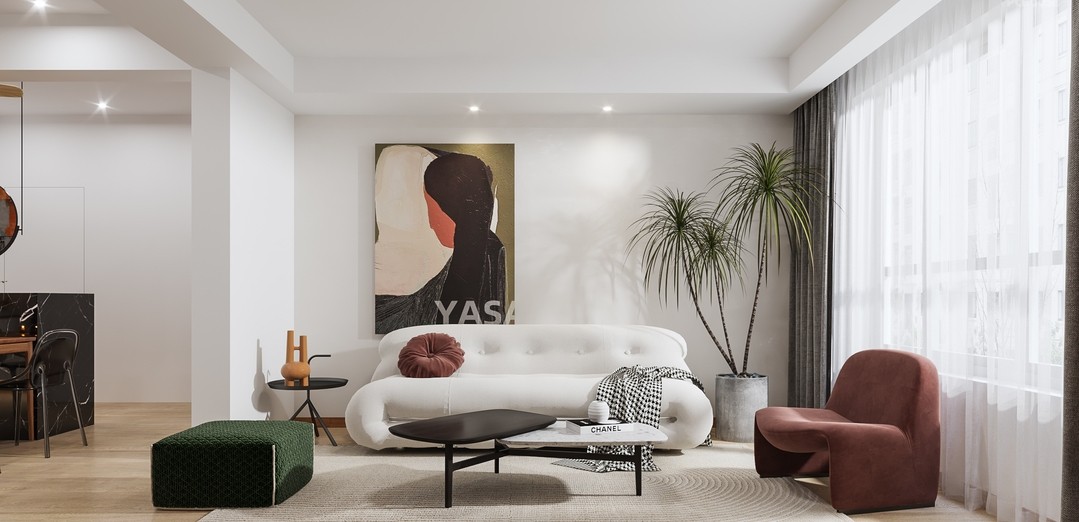 开放式空间优化了空间单一的调性,赋予了更多的想象,白色的墙面,浅木色的地板,设计师在空间的设计上用白色与木色来平衡空间的动与静,使空间舒适、简约、温暖。沙发选择较为舒适的布艺且色彩感强,让整个空间充满了活力和温馨的感觉。