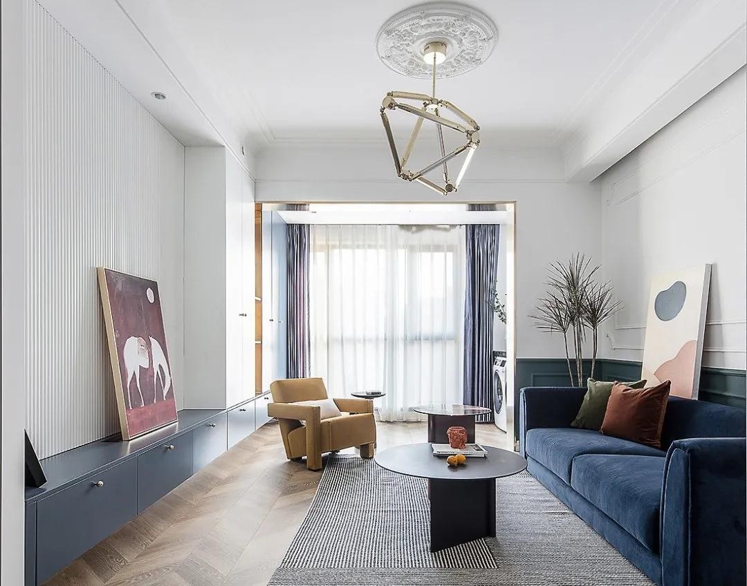 客厅,纯白墙面和无吊顶的设计让空间更显得开阔,电视背景墙纹理富有质感,底面的蓝色电视柜一直延伸到阳台晾衣区,保证收纳完备而且空间韵律浑然一体。