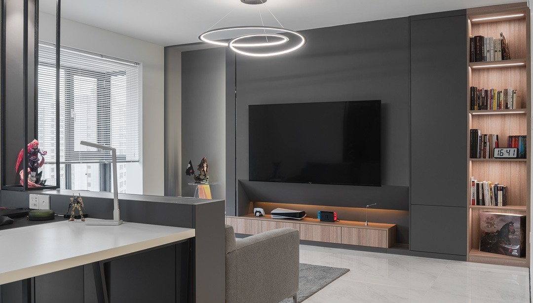 打通了沙发背景墙与书房,使整个空间更加通透大气,在客厅就可以看到男主人珍藏的手办墙,灰色的仿岩板推拉门强调了区域的独立性。