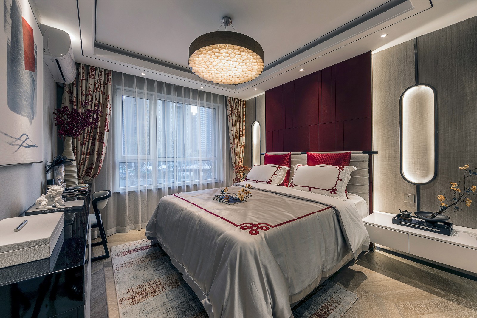 极具舒适度和实用性的居住空间里,中国结元素是空间的点睛之笔,红色是中国文化的底色,醇厚中又带着惊艳,灿烂至极。