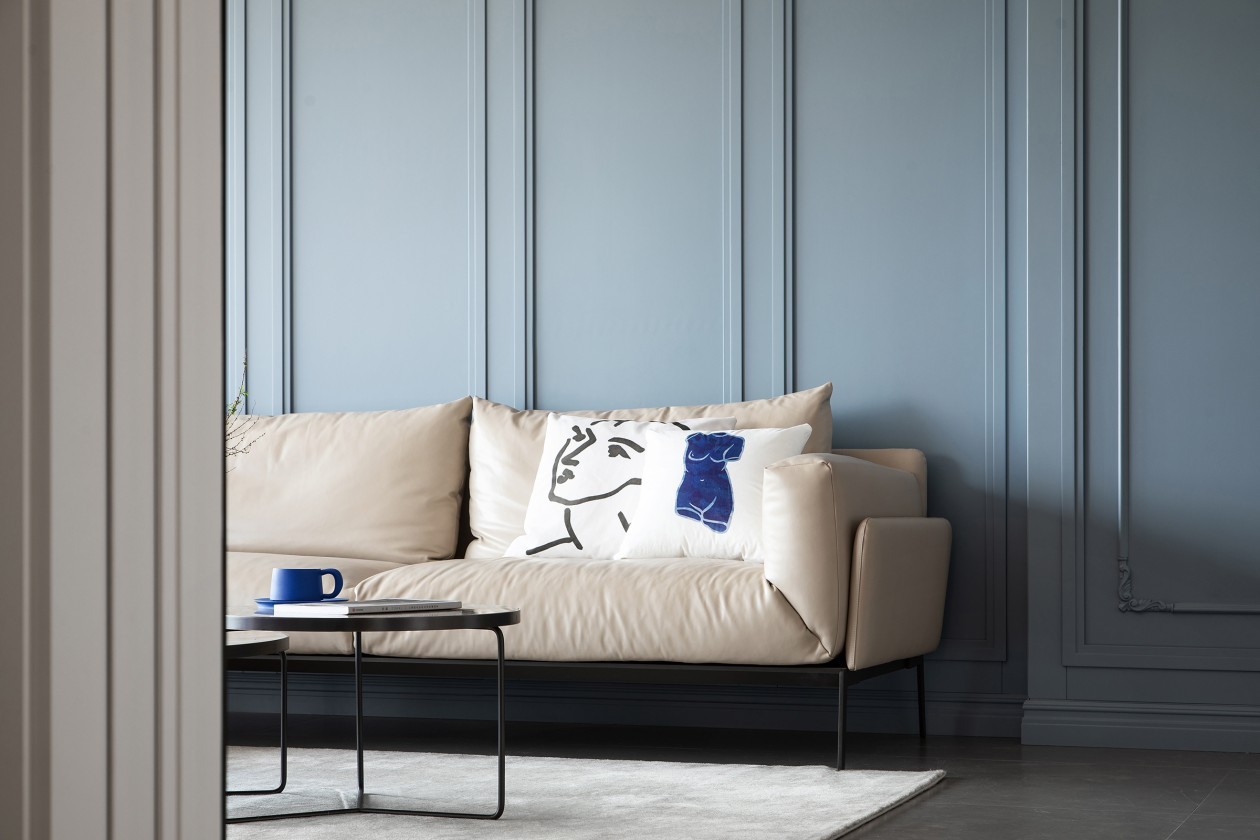 沙发背景墙摒弃繁杂的欧式雕花造型,采用简约又不失精致的线框型护墙板,特意延展至过道区域,成为一处亮眼的端景。