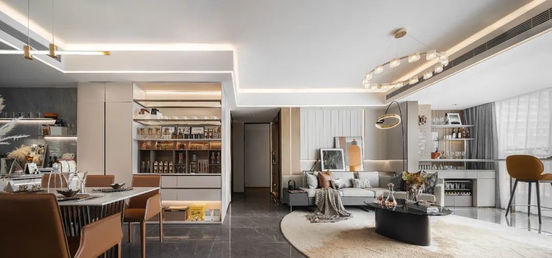 客厅作为功能性与艺术性的一个过渡,将功能与美学充分融合,空间以简约的造型及色彩的演绎,抽象表现出空间的多重思维与多元意境, 全方位展现都市情怀,谱写着关于家的,温暖的乐章。