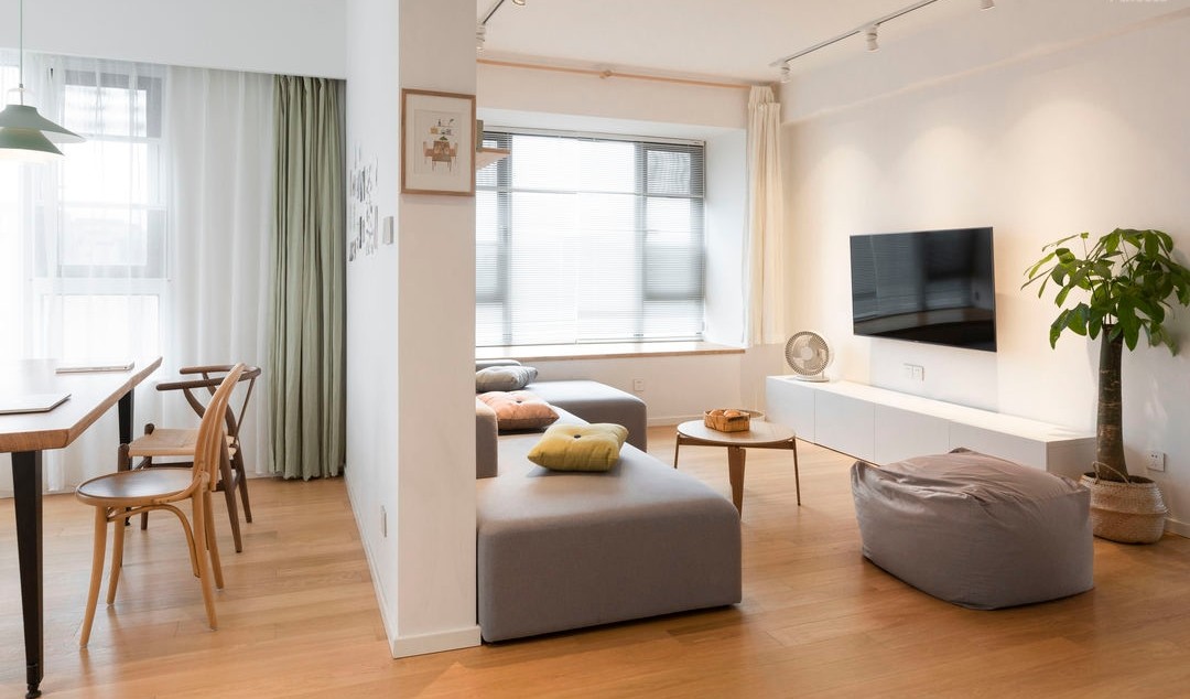 家里整体的颜色以干净的白色+原木色为主,点缀色是由***看好的餐桌灯的薄荷绿延展开,窗帘,墙上的装饰置物架都似乎是招手呼应。