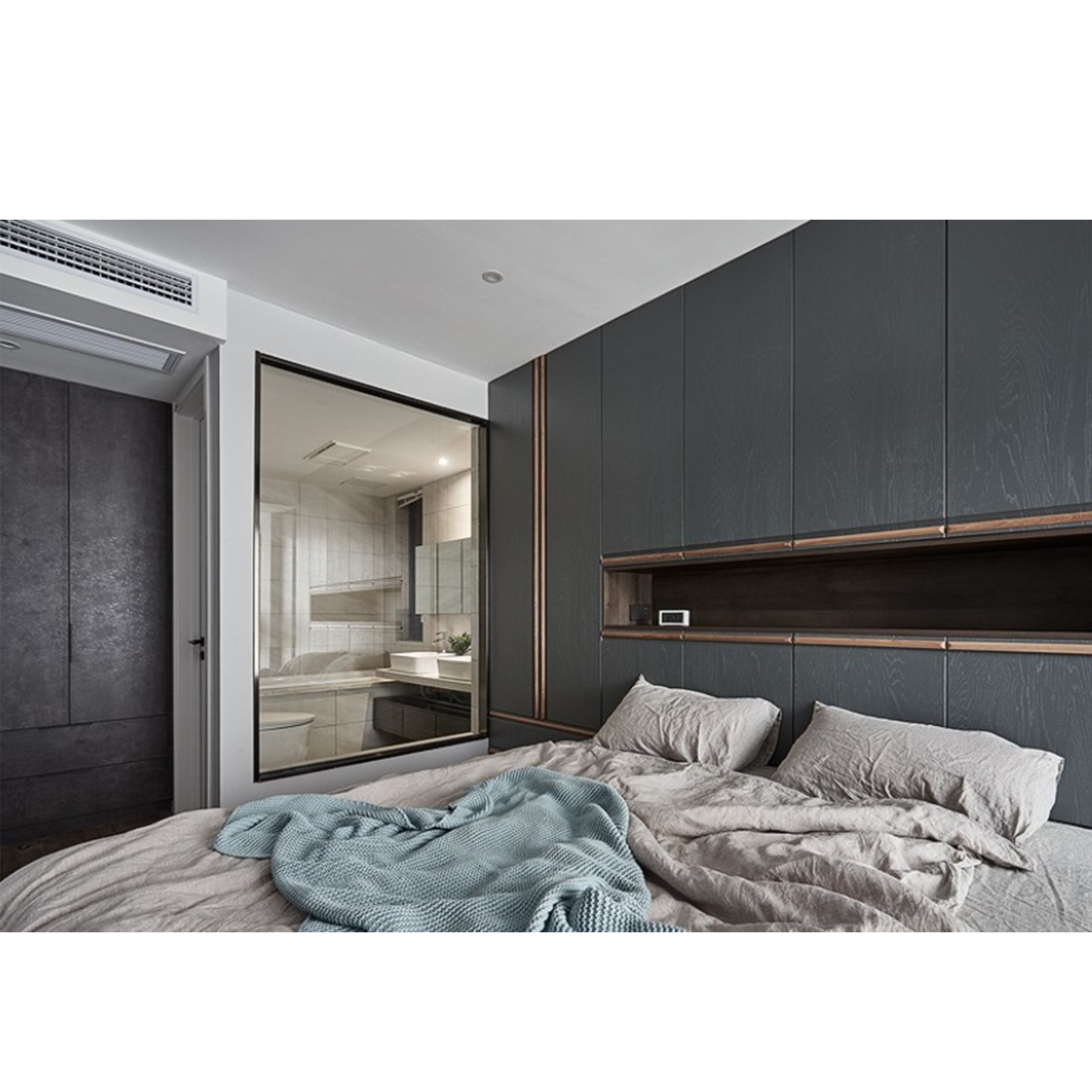 卧室延续了整体简洁的设计风格,淡雅沉稳的配色使得整个睡眠区更加深邃放松,微水泥与原木的映衬下,整个空间显得通透而静谧,多角度诠释了空间的神秘氛围。