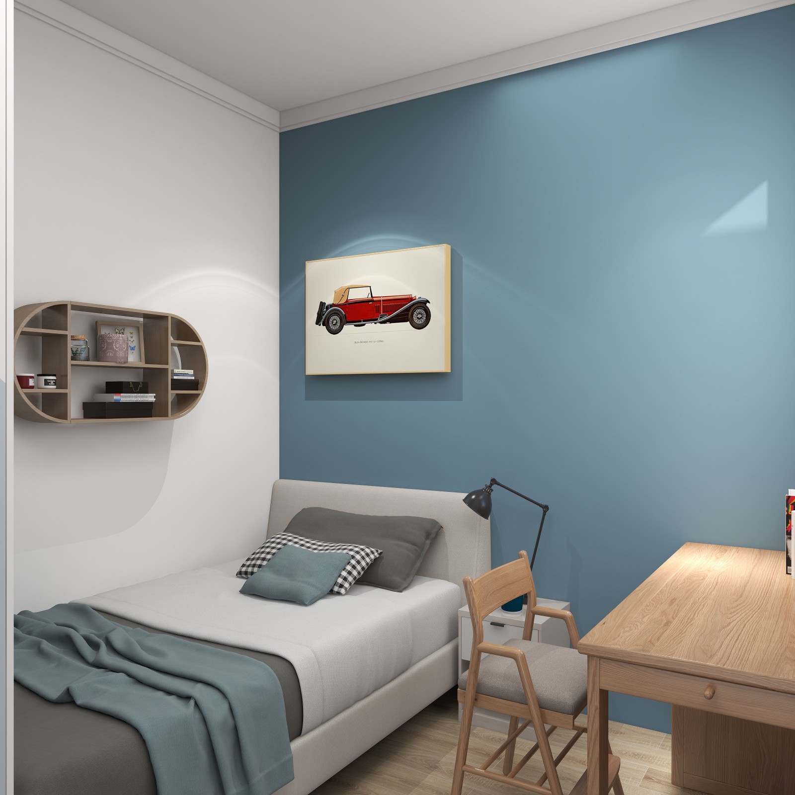 宝贝1.2米的床、写字台、自己独立的衣柜,或者叫衣帽间,还有一个1.7米的到顶书柜,整个空间不大不小,舒适度很高,写字台的采光很高,配合床头柜,有那么一点点老板桌的意思,床头柜类似老板桌的辅台。