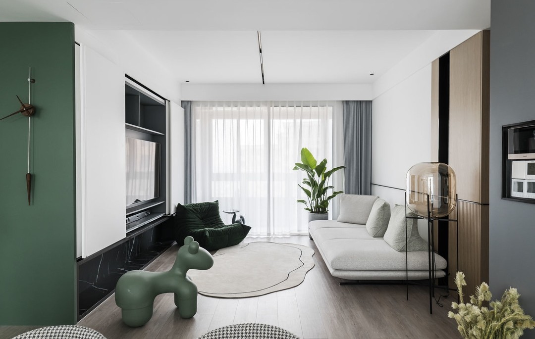 客厅的设计以简洁大方为主,电视背景墙与一般的电视柜不同,中间是可活动的活页移门,无需使用时合上便是图上的效果,纯白色柜门搭配下方黑色大理石,经典黑白配,大气优雅。