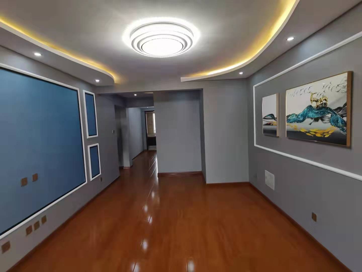 背景采用蓝色凸出影视墙的亮眼,整体灰色,提高业主的品味气质
