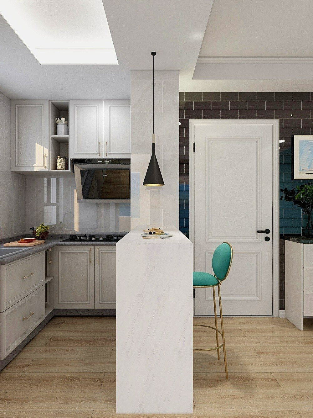 厨房:厨房拆掉隔墙,扩大空间,增加吧台互动。采光通风更加优化