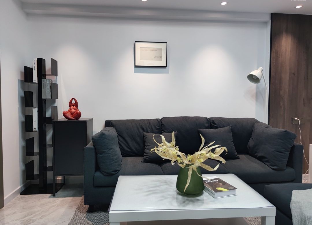 整个空间是素净、文艺、极简的,但我们还需要它具备沉稳,所以选择了深灰色布艺沙发、胡桃木色和灰色地砖压色