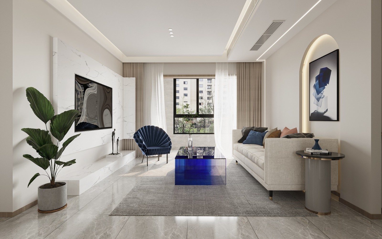 整体也以白色为主色调,搭配代表着理智与洁净的海蓝渐变色茶几+蓝玫瑰挂画作为点缀,给人一种平静安宁的感受。