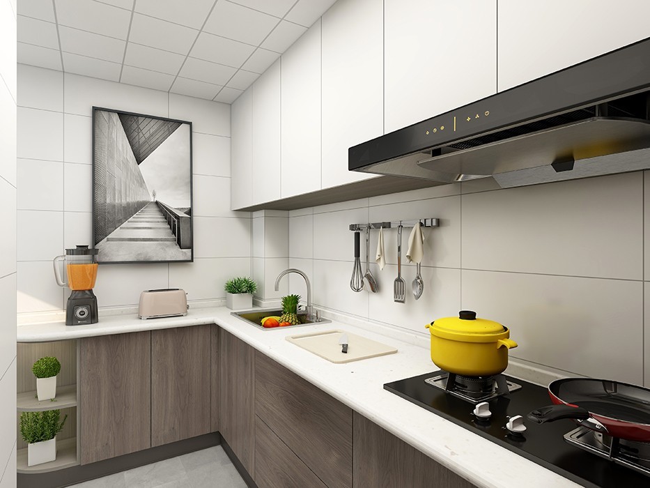 上下两个颜色,更有层次感。转角窄柜,储物和小型电器区域。