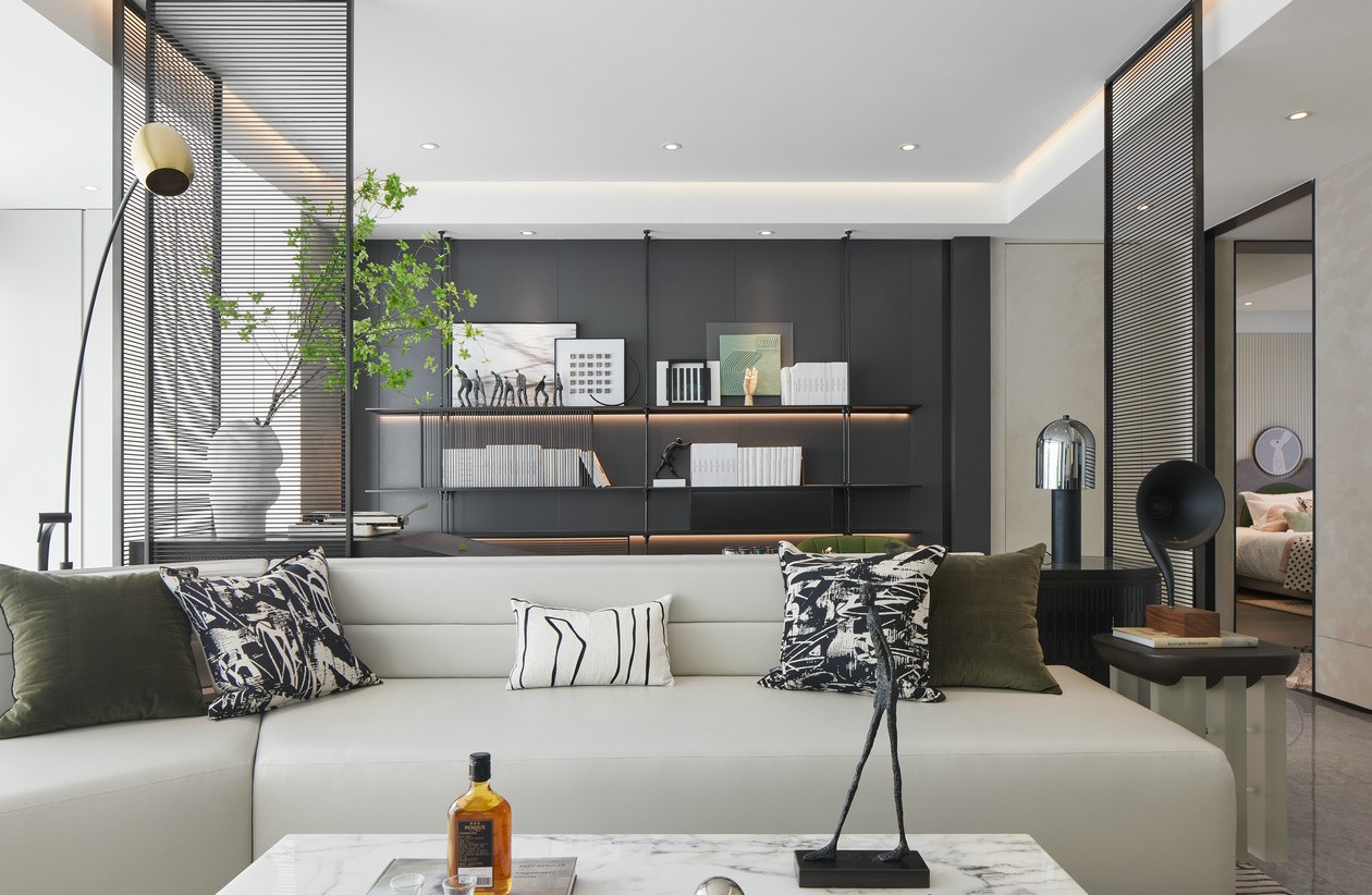 飘窗一路延展,与室外自然亲密接触,可倚窗观雨、临轩听风,通透且拉伸客厅景深效果。大理石、皮具、布艺、艺术岩板……各种材质的碰撞,让文化与空间更好交融。
