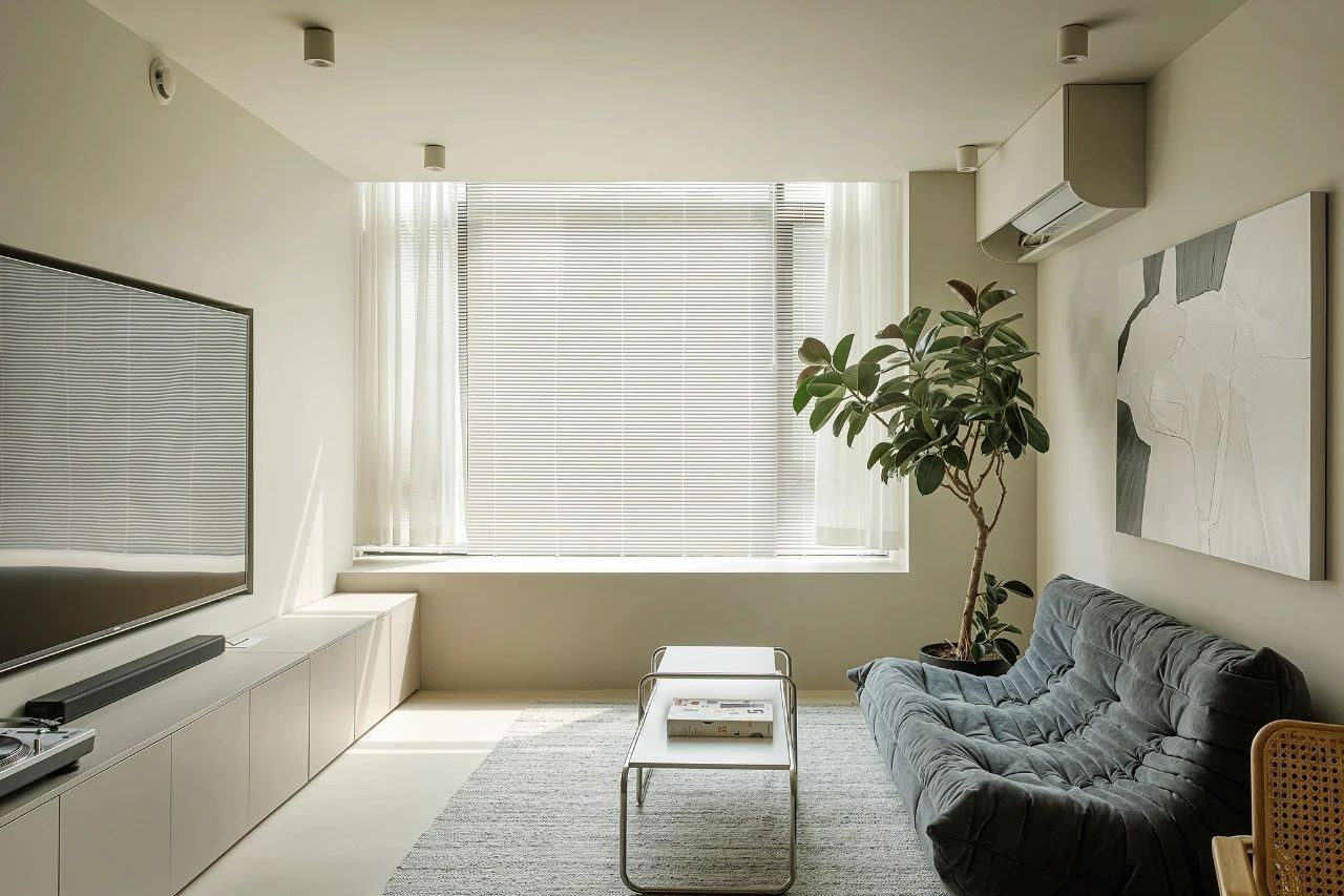 客厅处将电视做内嵌处理,弱化超大电视机在空间中的视觉体量。百叶窗搭配窗帘,过滤大面积窗户带来的过剩光线,释放柔和自然光
