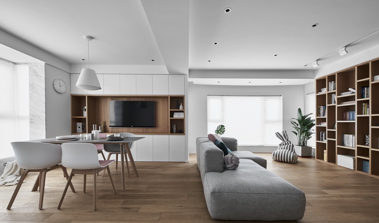 木色略微带着日式的自然感,结合灰白色的搭配,用沙发与桌椅的材质将氛围拉回主题,也是别出心裁了。