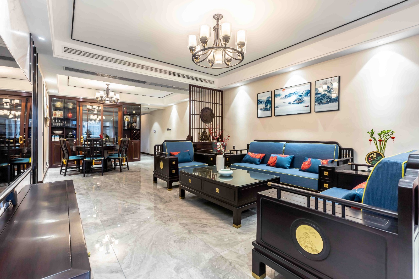 餐厅后方的装饰画一笔一划勾勒出对东方元素的尊重,让整个空间都沉寂在属于新中式的大气之中。