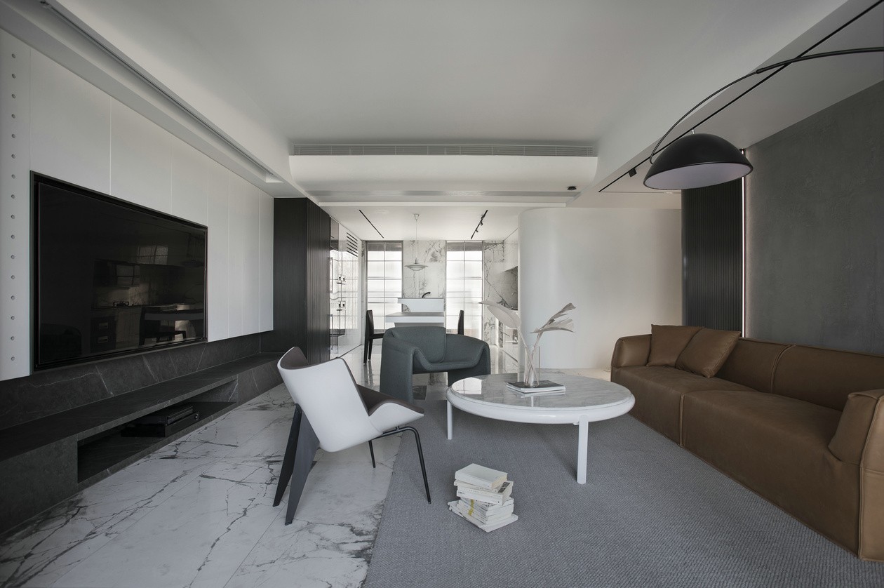 以开放式的构架设计整个空间,以素雅的艺术漆为基底,塑造了一种雕塑视觉感。带弧状的天花板,映衬着光影更显温度。