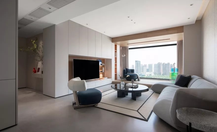 客厅背景基于原建筑结构墙的深度做了不同功能的分类收纳。