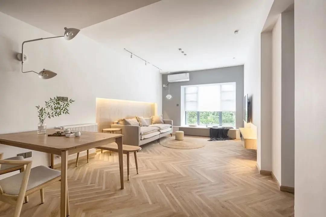 木地板的铺设,也选择了较为新颖时尚的人字拼方式,整个贯穿于客餐厅、过道及卧室,很漂亮