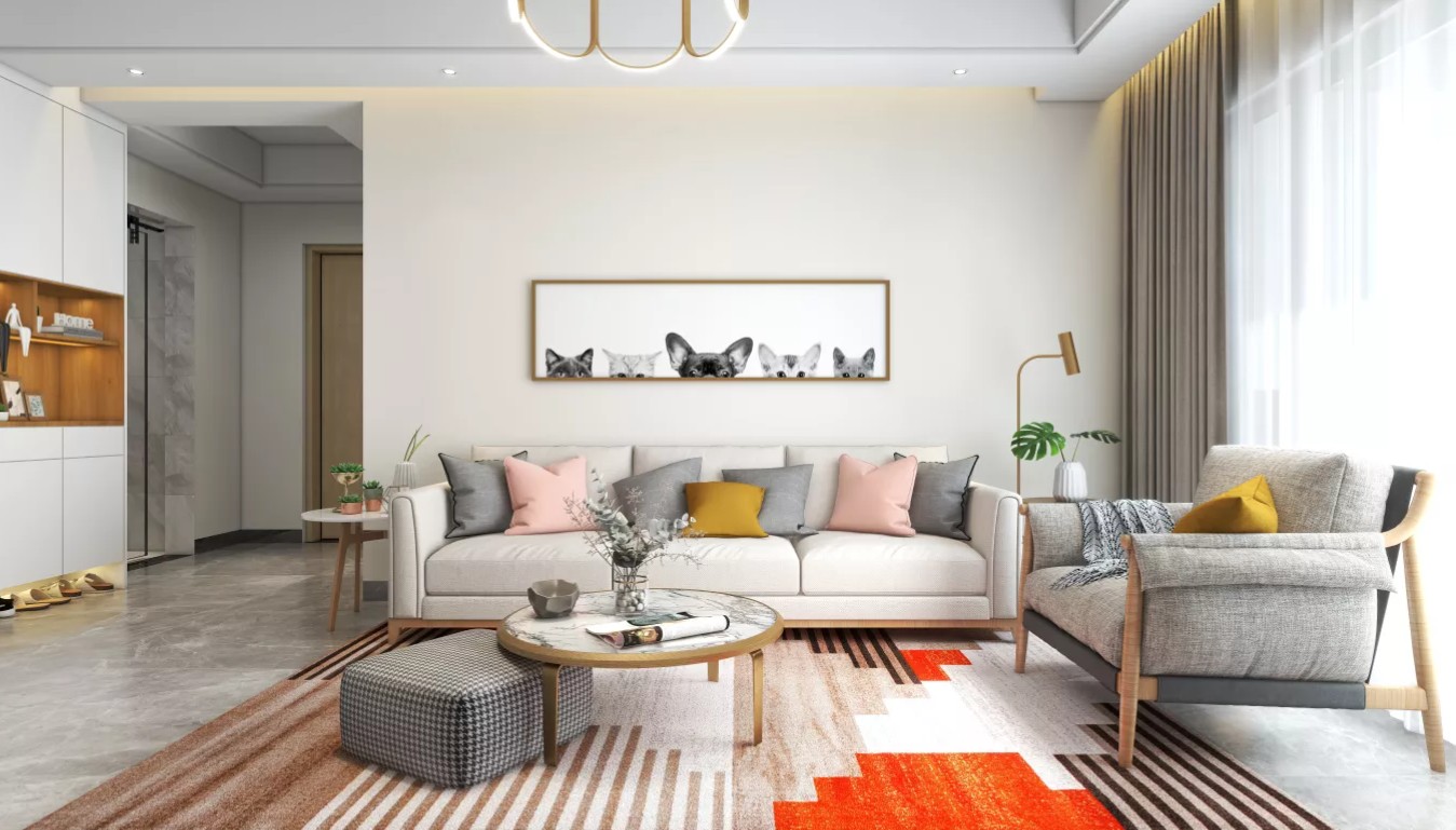 客厅顶面设计暗藏窗帘盒,悬空灯槽布艺沙发,搭配小格子地毯
