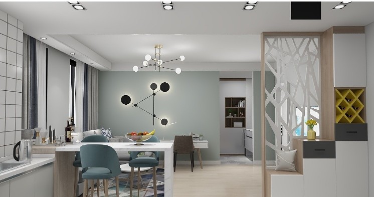 有限的空间,如何体现设计感?同时又满足使用性?厨房、餐厅最初空间较拥挤,于是我们将厨房改造成开放式空间,三个空间联通,宽敞透亮许多
