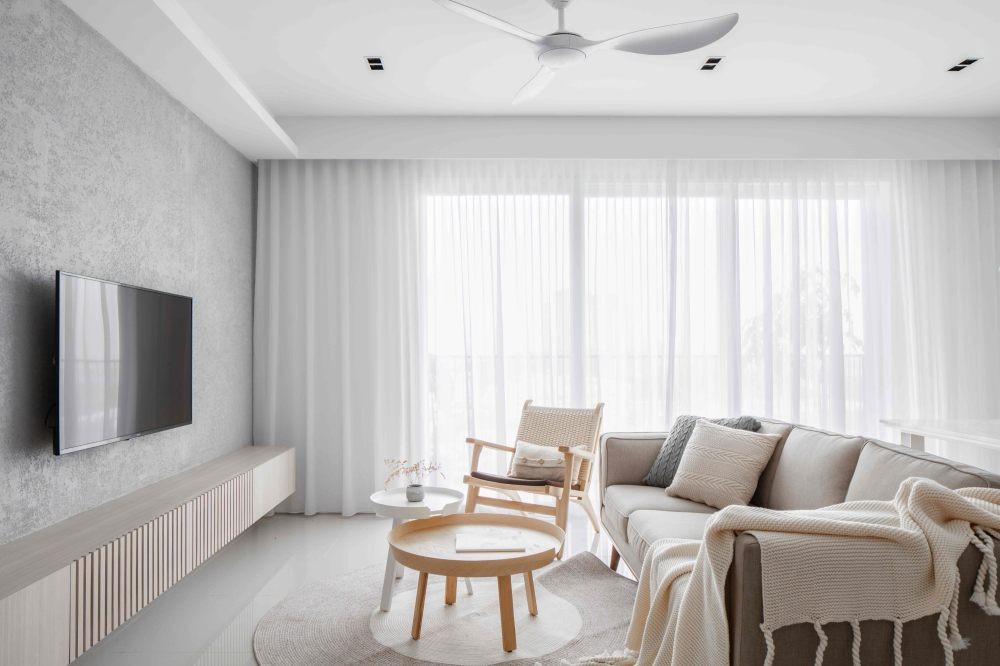木地板与地砖的完美结合,好像是在给空间分区,一侧墙上安装投影幕布,块面组合的形式十分***,设计将雅致生活与现代艺术结合,并借由开放的布局、灵活的动线,共同构建整个空间简洁又极具质感的视觉印象。