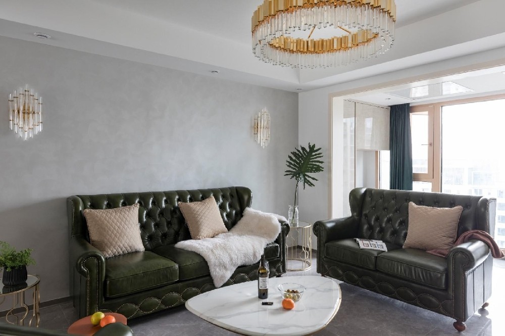 为了融合沙发的气质,灯具,茶几的选择上煞费苦心。从客厅一眼望去,整个空间层次分明又宽敞大气,让整个空间显得很有活力