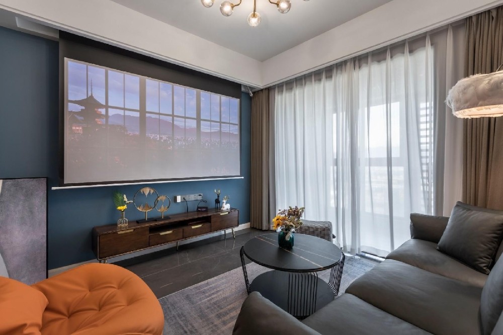 电视面一大片的灰蓝色,结合后现代优雅的质感,赋予了这套住宅空间悠远的韵味。