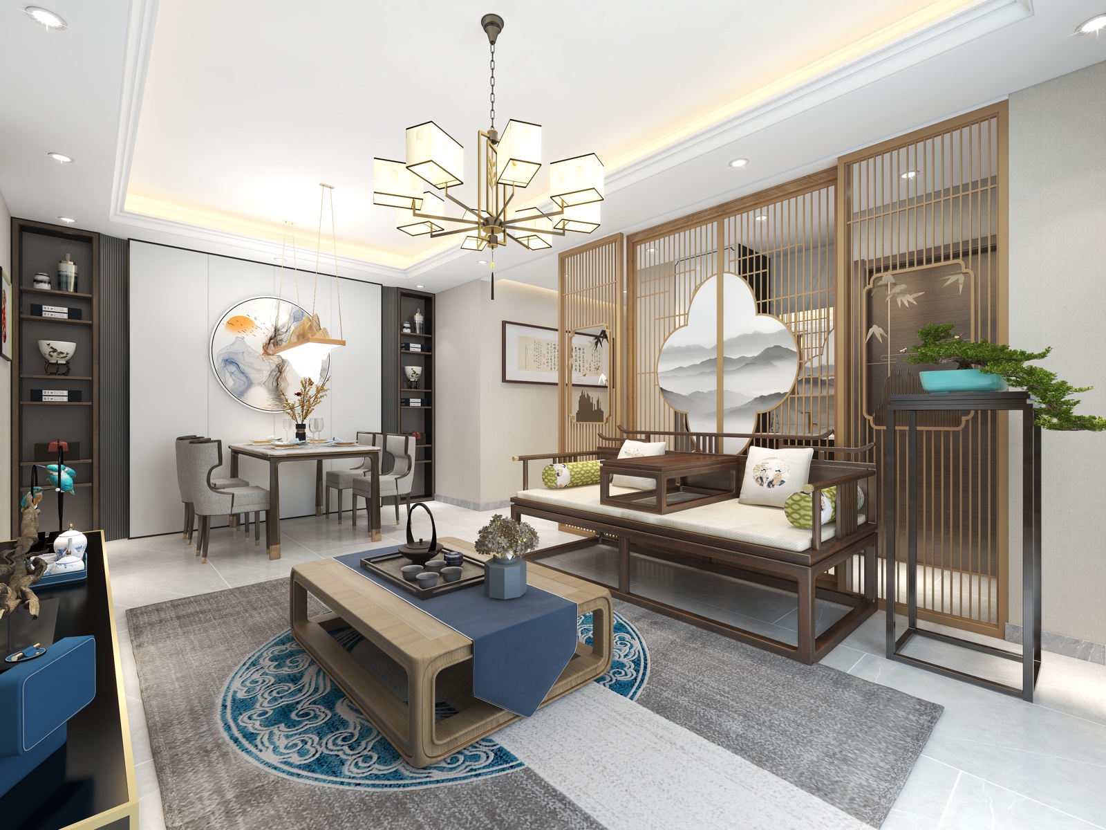 在客厅侧面也做了护墙板,还做一个百宝格,既然是新中式,肯定是有很多的摆件需要展示。