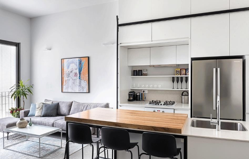 一侧是厨房和沙发,另一侧是黑色的整体立柜