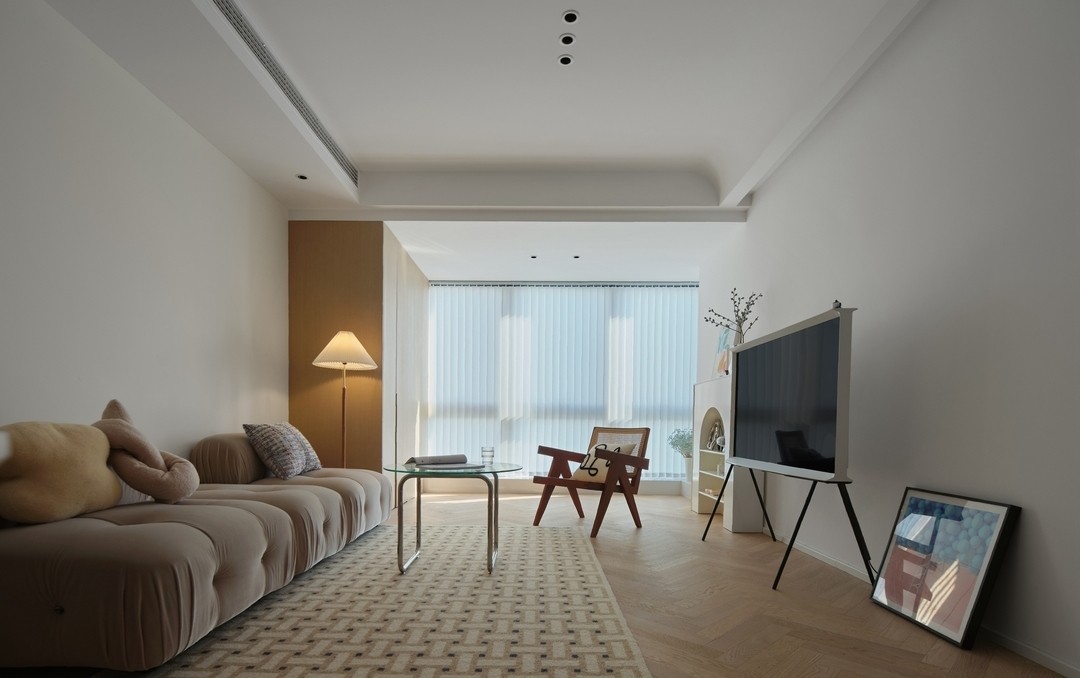 客厅空间在强调一种简洁与舒适,没有花哨的装饰和陈设,原木的质地让空间沉浸在柔和的氛围里。在功能结构上,将阳台纳入客厅并且在装饰材质上进行统一化处理,利用叠级吊顶弱化阳台梁体的问题,让两个空间合二为一