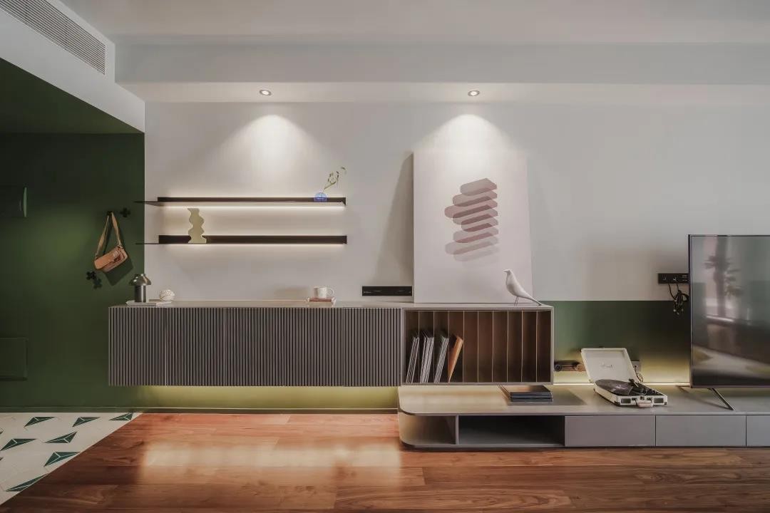 玄关的简白+墨绿几何拼接地砖,与公区的木地板形成自然分隔,将鞋底尘灰和工作烦恼都限定于此,营造归家仪式感。 悬空壁柜依次分为鞋柜(约1.6米长,屋主物欲不高,鞋子衣物等也比较精简,足够使用)、杂物收纳区和端头的黑胶唱片开放格,底部嵌入暖色灯带,雕塑出轻盈体态。