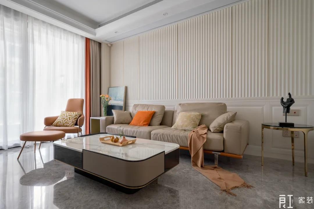 客厅以奶茶色作为主基调,搭配部分橘橙跳色